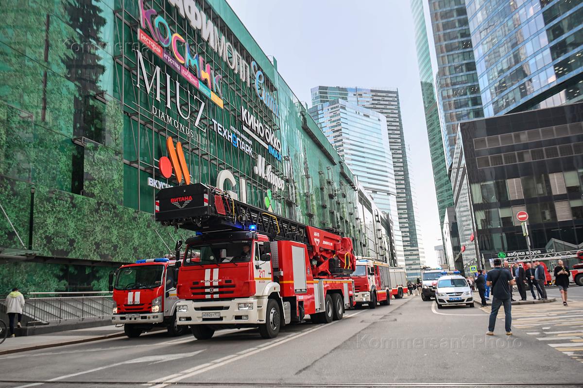 Пожар на подземной парковке Торгово-развлекательного центра (ТРЦ) "Афимолл Сити" на территории Московского международного делового центр (ММДЦ) "Москва Сити". Жанровая фотография. Машины пожарной службы МЧС России у ТРЦ "Афимолл Сити". Башня "Меркурий".