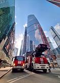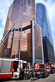 Пожар на подземной парковке Торгово-развлекательного центра (ТРЦ) "Афимолл Сити" на территории Московского международного делового центр (ММДЦ) "Москва Сити". Жанровая фотография. Машины пожарной службы МЧС России у ТРЦ "Афимолл Сити". Башня "Меркурий".