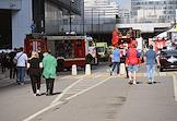 Пожар на подземной парковке Торгово-развлекательного центра (ТРЦ) "Афимолл Сити" на территории Московского международного делового центр (ММДЦ) "Москва Сити". Жанровая фотография. Машины пожарной службы МЧС России у ТРЦ "Афимолл Сити".