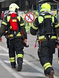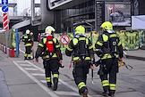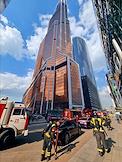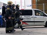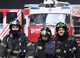 Пожар на подземной парковке Торгово-развлекательного центра (ТРЦ) "Афимолл Сити" на территории Московского международного делового центр (ММДЦ) "Москва Сити". Жанровая фотография. Сотрудники пожарной службы МЧС России у ТРЦ "Афимолл Сити".