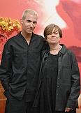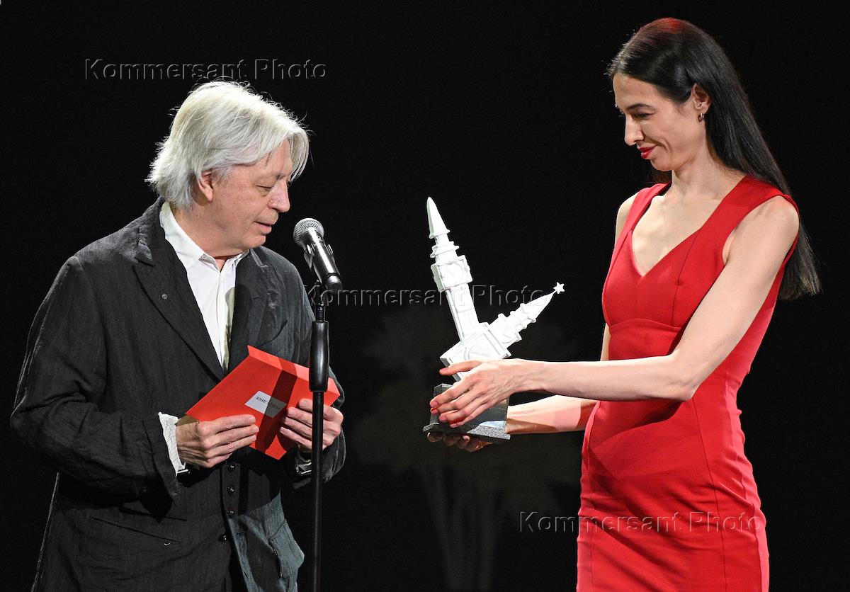 Церемония вручения XIII ежегодной премии The Art Newspaper Russia в Московском драматическом театре имени А. С. Пушкина. Художник, Музыкант Сергей (Африка) Бугаев (слева) и директор Мультимедиа Арт Музея Ольга Свиблова на церемонии.