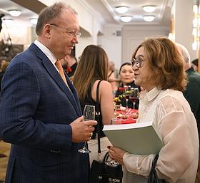 Церемония вручения XIII ежегодной премии The Art Newspaper Russia в Московском драматическом театре имени А.С.Пушкина. Ректор Дипломатической академии МИД России Александр Яковенко (слева) и искусствовед, куратор Зельфира Трегулова (справа) на церемонии.