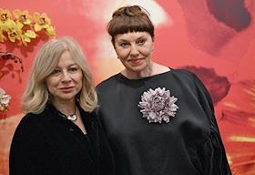 Церемония вручения XIII ежегодной премии The Art Newspaper Russia в Московском драматическом театре имени А.С.Пушкина. Издатель российской газеты The Art Newspaper Russia Ольга Ярутина (слева) и генеральный директор газеты The Art Newspaper Russia и директор премии The Art Newspaper Russia Татьяна Сахокия (справа) на церемонии.