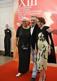 Церемония вручения XIII ежегодной премии The Art Newspaper Russia в Московском драматическом театре имени А.С.Пушкина. Главный редактор The Art Newspaper Russia Милена Орлова (слева) и художник Георгий Острецов (в центре) на церемонии.