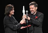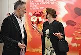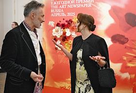 Церемония вручения XIII ежегодной премии газеты The Art Newspaper Russia в Московском драматическом театре имени А. С. Пушкина. Художник Андрей Логинов (слева) и генеральный директор газеты The Art Newspaper Russia Татьяна Сахокия (справа) на церемонии.