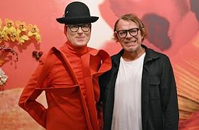 Церемония вручения XIII ежегодной премии The Art Newspaper Russia в Московском драматическом театре имени А.С.Пушкина. Модельер Андрей Бартенев (слева) и художник, музыкант, актер Сергей Бугаев (Африка) (справа) на церемонии.