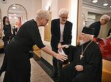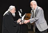 Церемония вручения XIII ежегодной премии The Art Newspaper Russia в Московском драматическом театре имени А.С.Пушкина. Директор Центрального музея древнерусского искусства имени Андрея Рублёва Михаил Миндлин (справа) и настоятель Звенигородского Успенского собора архимандрит Иероним (слева) на церемонии.