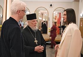 Церемония вручения XIII ежегодной премии The Art Newspaper Russia в Московском драматическом театре имени А.С.Пушкина. Слева направо: заместитель директора по науке Звенигородского музея-заповедника Дмитрий Седов, настоятель Звенигородского Успенского собора архимандрит Иероним и издатель российской газеты The Art Newspaper Russia Ольга Ярутина на церемонии.