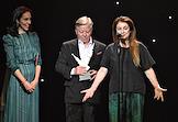 Церемония вручения XIII ежегодной премии The Art Newspaper Russia в Московском драматическом театре имени А.С.Пушкина. Справа налево: куратор выставочного направления Культурного центра "Зотов" Полина Стрельцова, архитектор, куратор Юрий Аввакумов и генеральный директор Культурного центра "Зотов" Дарья Филиппова на церемонии.