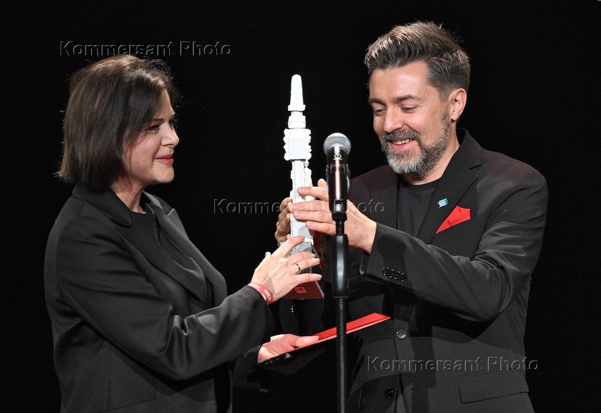 Церемония вручения XIII ежегодной премии The Art Newspaper Russia в Московском драматическом театре имени А.С.Пушкина. Главный редактор The Art Newspaper Russia Милена Орлова (слева) и художник Георгий Острецов (в центре) на церемонии.