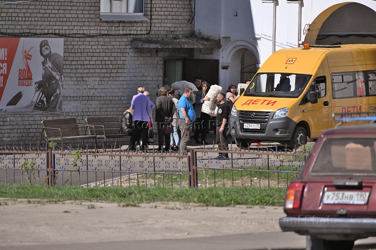 Ситуация в Киржачском районе Владимирской области после взрывов боеприпасов на военных складах. Жанровая фотография. Жители района у пункта временного размещения.