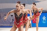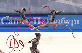 Матчевая встреча команд Санкт-Петербурга и Минска по художественной гимнастике, посвященная 80-летию победы в Великой Отечественной войне, в Центре художественной гимнастики "Жемчужина". Российские гимнастки Мария Борисова (слева), Ангелина Ипатова (справа) и белорусская гимнастка Алина Горносько (в центре) во время церемонии награждения.