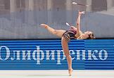 Матчевая встреча команд Санкт-Петербурга и Минска по художественной гимнастике, посвященная 80-летию победы в Великой Отечественной войне, в Центре художественной гимнастики "Жемчужина". Российская гимнастка Нина Олифиренко во время выступления.