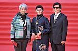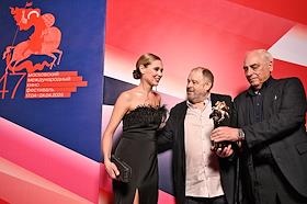 47-й Московский международный кинофестиваль (ММКФ). Церемония закрытия в Московском театре мюзикла. Слева направо: сценарист Мария Маслова, режиссер Антон Маслов и актер Кирилл Русин на церемонии.