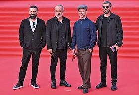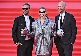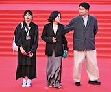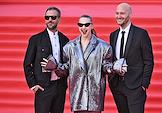 47-й Московский международный кинофестиваль (ММКФ). Церемония закрытия в Московском театре мюзикла. Члены жюри конкурса короткометражного кино: актер, режиссер, сценарист Эркан Колчак Кёстендиль, актриса Юлия Хлынина и режиссер, продюсер, актер Фабио Масса во время церемонии.