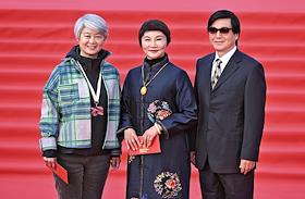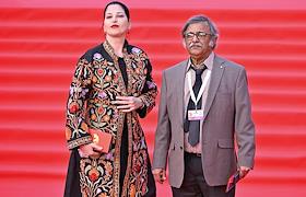 47-й Московский международный кинофестиваль (ММКФ). Церемония закрытия в Московском театре мюзикла. Члены жюри NetPACK (организации по продвижению азиатского кино): кинокритик, писатель, организатор кинофестивалей Премендра Мазумдер (справа) и киновед, кинокритик, профессор Андроника Мартонова (слева) во время церемонии.