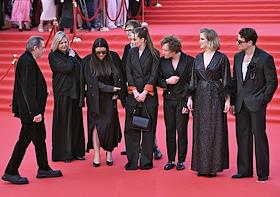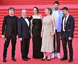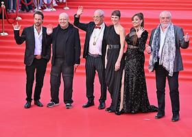 47-й Московский Международный Кинофестиваль (ММКФ). Церемония закрытия в Московском театре мюзикла. Слева направо члены жюри основного конкурса: актриса, певица, глава компании I Productions, консультант по кино при министерстве культуры Египта Бушра, актер Джон Робинсон, режиссер Алексей Герман-младший, председатель жюри, режиссер Луис Миньярро, актриса Марьяна Спивак и режиссер, сценарист, продюсер Корнел Георгицэ на церемонии.