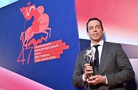 47-й Московский международный кинофестиваль (ММКФ). Церемония закрытия в Московском театре мюзикла. Заместитель чрезвычайного и полномочного посла Испании в России Давид Каррера получает Серебряного Святого Георгия за лучшее исполнение женской роли за актрису Марию Родриго Сото в фильме "Дом в огне" (A House on Fire) на церемонии.
