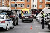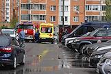Последствия взрыва автомобиля на бульваре Нестерова в микрорайоне Авиаторов. Автомобили скорой медицинской помощи, пожарной охраны МЧС России и правоохранительных органов на месте происшествия. В результате террористической атаки погиб заместитель начальника Главного оперативного управления Генерального штаба вооруженных сил России Ярослав Москалик.