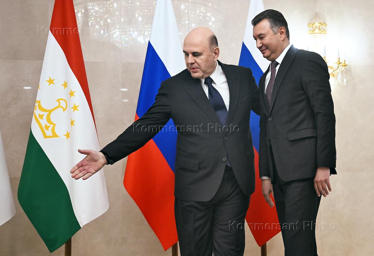 Переговоры председателя правительства России Михаила Мишустина и премьер-министра Таджикистана Кохира Расулзада в Доме правительства России. Председатель правительства России Михаил Мишустин (слева) и премьер-министр Таджикистана Кохир Расулзада перед началом переговоров.
