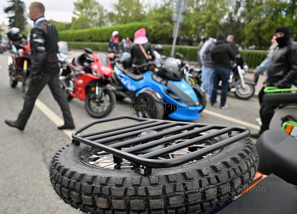 Московский мотофестиваль, посвященный открытию мотосезона. В этом году мероприятие посвящено 80-летию Победы в Великой Отечественной войне. Участники фестиваля во время мотопробега.
