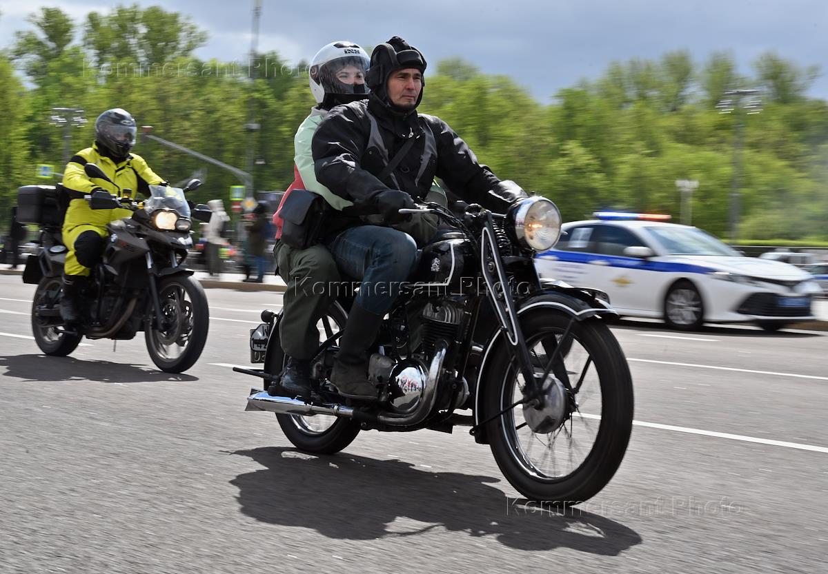 Московский мотофестиваль, посвященный открытию мотосезона. В этом году мероприятие посвящено 80-летию Победы в Великой Отечественной войне. Участники фестиваля во время мотопробега.