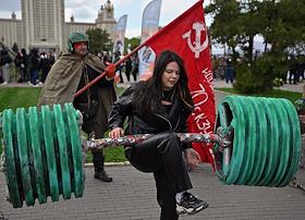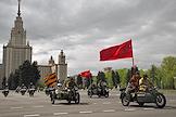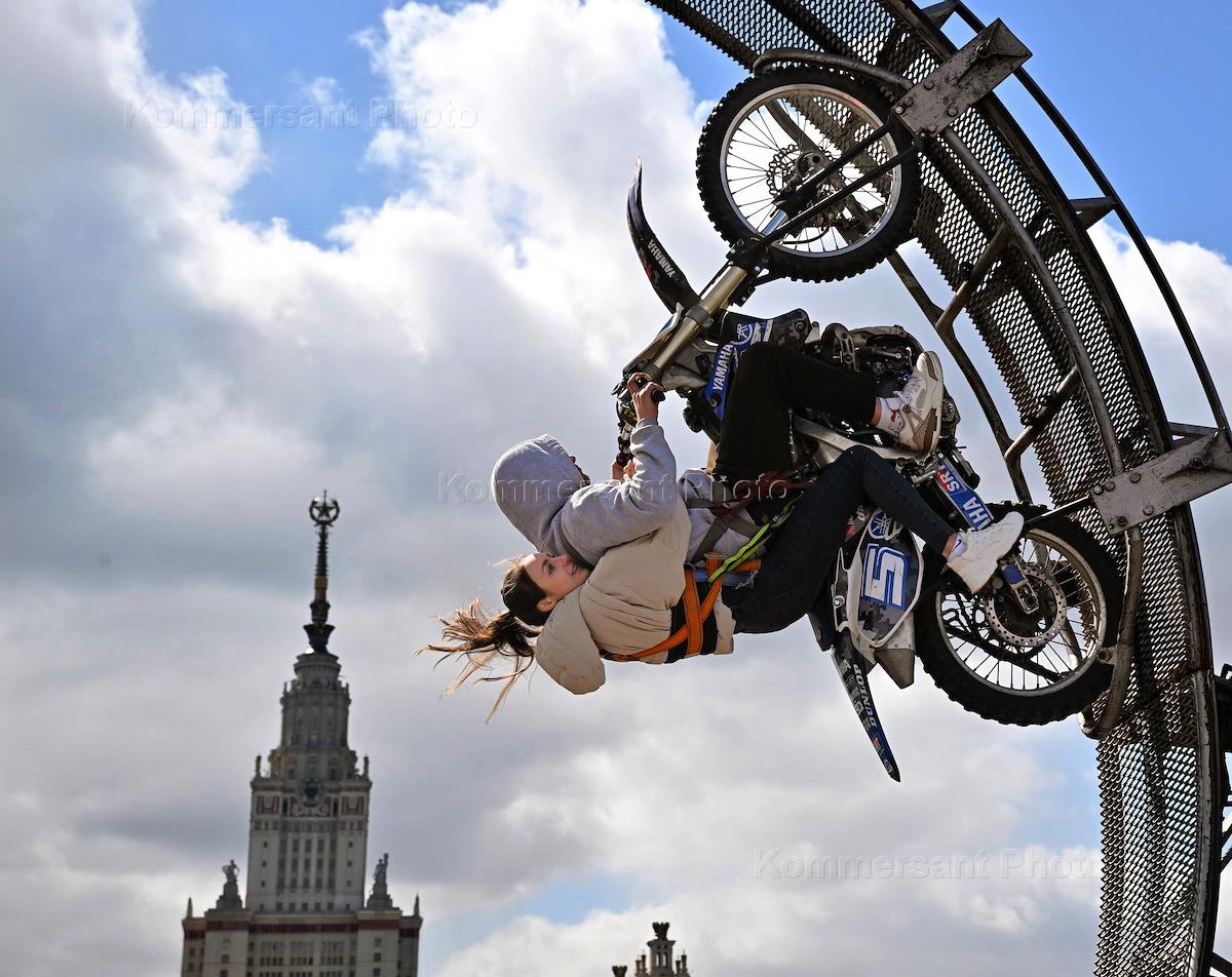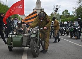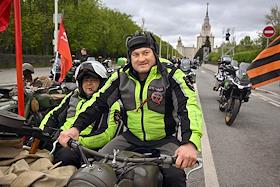 Московский мотофестиваль, посвященный открытию мотосезона. В этом году мероприятие посвящено 80-летию Победы в Великой Отечественной войне. Участники фестиваля на Университетской площади на Воробьевых горах.