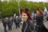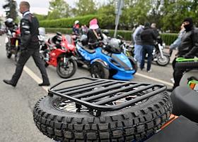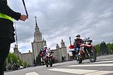 Московский мотофестиваль, посвященный открытию мотосезона. В этом году мероприятие посвящено 80-летию Победы в Великой Отечественной войне. Сотрудники полиции и участники фестиваля на Университетской площади на Воробьевых горах.