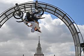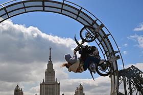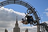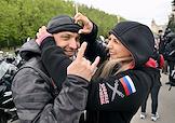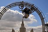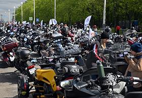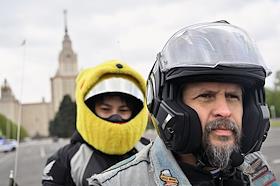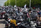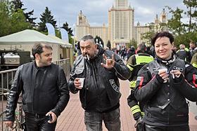 Московский мотофестиваль, посвященный открытию мотосезона. В этом году мероприятие посвящено 80-летию Победы в Великой Отечественной войне. Участники фестиваля на Университетской площади на Воробьевых горах. Выступления участников фестиваля.