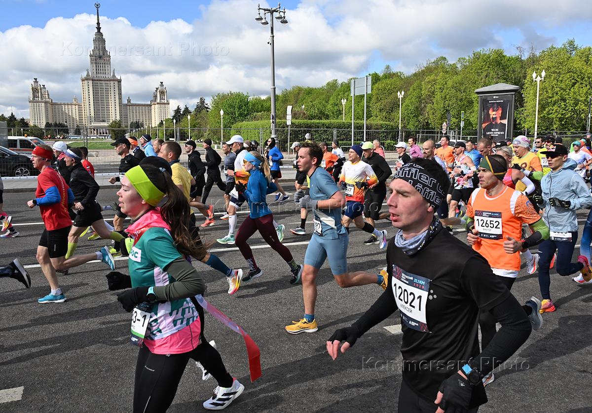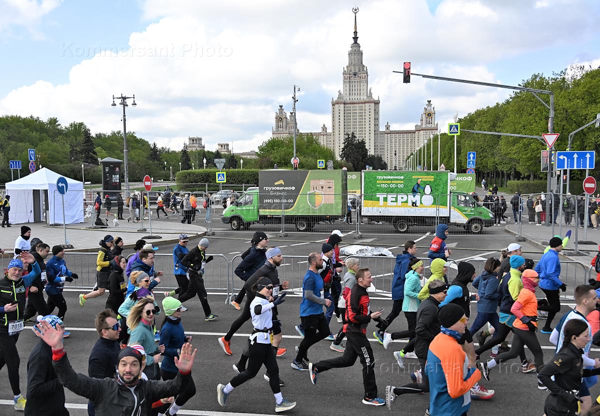XI Московский полумарафон. Забег на 21,1 км от Университетской площади МГУ до Большой спортивной арены спортивного комплекса "Лужники". Жанровая фотография. Участники во время забега.