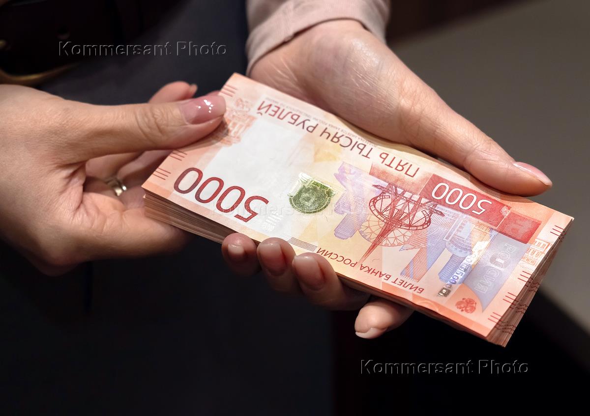 Деньги. Жанровая фотография. Женщина пересчитывает купюры достоинством пять тысяч рублей.