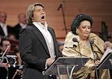 Российский певец Николай Басков (слева) и испанская оперная певица Монтсеррат Кабалье (справа) во время выступления на концерте в Московском Международном Доме Музыки (ММДМ).
