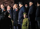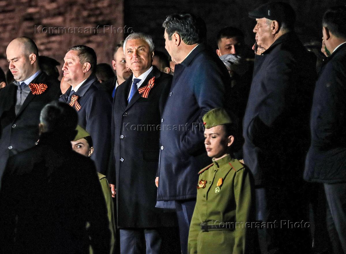 Акция "Свет Великой Победы", приуроченная к 80-летию Победы в Великой Отечественной войне, на территории мемориального комплекса Мамаев курган. Слева направо: спикер Народного Собрания – Парламента Абхазии Лаша Ашуба, губернатор Волгоградской области Андрей Бочаров и председатель Государственной думы России Вячеслав Володин во время акции.