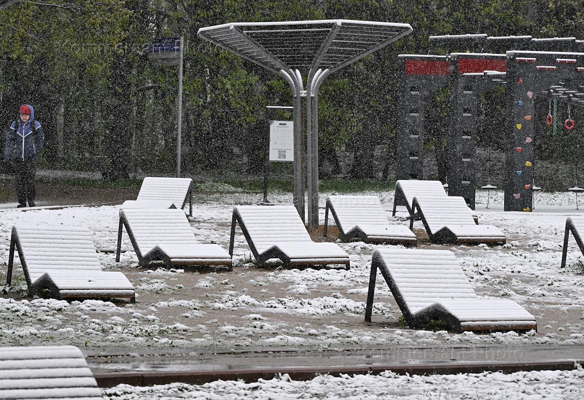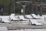 Виды Москвы во время снегопада. Жанровая фотография. Скамейки-шезлонги под снегом в парке.