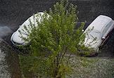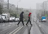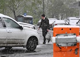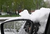 Виды Москвы во время снегопада. Жанровая фотография. Надпись "май" на заснеженном лобовом стекле автомобиля.