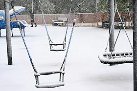 Виды Москвы во время снегопада. Жанровая фотография. Заснеженная детская площадка в парке.