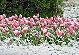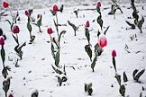 Виды Москвы во время снегопада. Жанровая фотография. Тюльпаны в снегу на клумбе.
