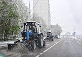 Виды Москвы во время снегопада. Жанровая фотография. Коммунальная техника во время уборки мокрого снега на проезжей части.
