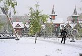 Виды Москвы во время снегопада. Жанровая фотография. Дворник во время уборки снега во дворе жилого дома.