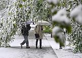 Виды Москвы во время снегопада. Жанровая фотография. Мужчина и женщина под зонтами на аллее парка во время снегопада.