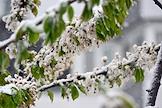 Виды Москвы во время снегопада. Жанровая фотография. Цветущая ветка яблони в снегу.