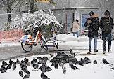 Виды Москвы во время снегопада. Жанровая фотография. Голуби греются на линии теплоцентрали во время снегопада.