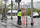 Виды Москвы во время снегопада. Жанровая фотография. Сотрудник "Спецдорпроекта" (КГУ ЦОДД) во время ремонта светофора.