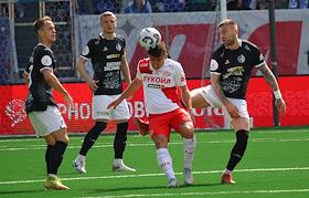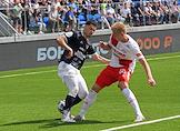 Мир Российская Премьер-Лига (РПЛ) 2024/2025. 27-й тур. Матч между командами "Факел" (Воронеж) - "Спартак М" (Москва) на стадионе "Факел". Игрок команды "Спартак" Роман Зобнин (второй справа) и игрок команды "Факел" Ильнур Альшин (справа) во время матча.