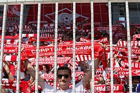 Мир Российская Премьер-Лига (РПЛ) 2024/2025. 27-й тур. Матч между командами "Факел" (Воронеж) - "Спартак М" (Москва) на стадионе "Факел". Болельщики команды "Спартак" на трибуне во время матча.