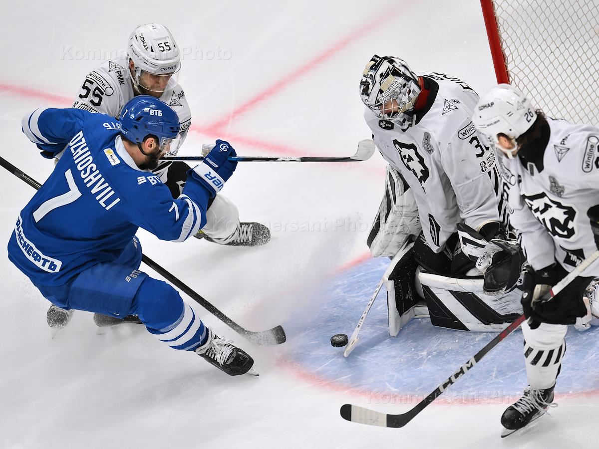 Фонбет - Континентальная хоккейная лига (КХЛ). Чемпионат сезона 2024/25. 1/2 финала. Матч между командами "Динамо М" (Москва) - "Трактор" (Челябинск) на стадионе "ВТБ Арена - имени Аркадия Чернышева". Игрок команды "Динамо" Дилан Сикура (в центре) во время матча.