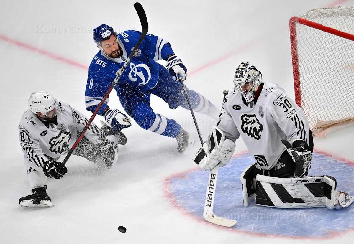 Фонбет - Континентальная хоккейная лига (КХЛ). Чемпионат сезона 2024/25. 1/2 финала. Матч между командами "Динамо М" (Москва) - "Трактор" (Челябинск) на стадионе "ВТБ Арена - имени Аркадия Чернышева". Слева направо: игрок команды "Трактор" Артем Блажиевский, игрок команды "Динамо" Антон Слепышев и вратарь команды "Трактор" Закари Фукале во время матча.