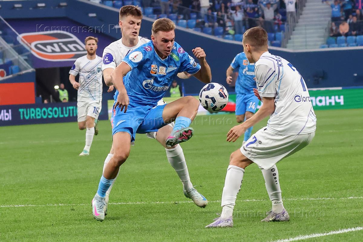 Мир Российская Премьер-Лига (РПЛ) 2024/2025. 27-й тур. Матч между командами "Зенит" (Санкт-Петербург) - "Пари Нижний Новгород" (Нижний Новгород) на стадионе "Газпром Арена". Игрок команды "Зенит" Максим Глушенков (в центре) во время матча.