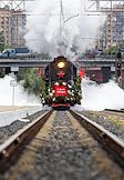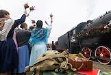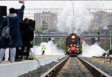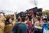 Акция "Эшелон Победы", посвященная 80-летию Победы в Великой Отечественной войне, на Северном вокзале в Калининграде. Состав, ведомый легендарным паровозом серии "Л", известным под символичным названием "Победа", во время прибытия.