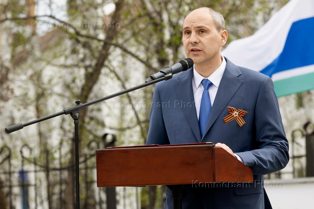 Всероссийская акция "Храним огонь Победы". Церемония зажжения Вечного огня на территории мемориального комплекса, посвященного среднеуральцам, погибшим в годы Великой Отечественной войны. Временно исполняющий обязанности губернатора Свердловской области Денис Паслер во время церемонии.